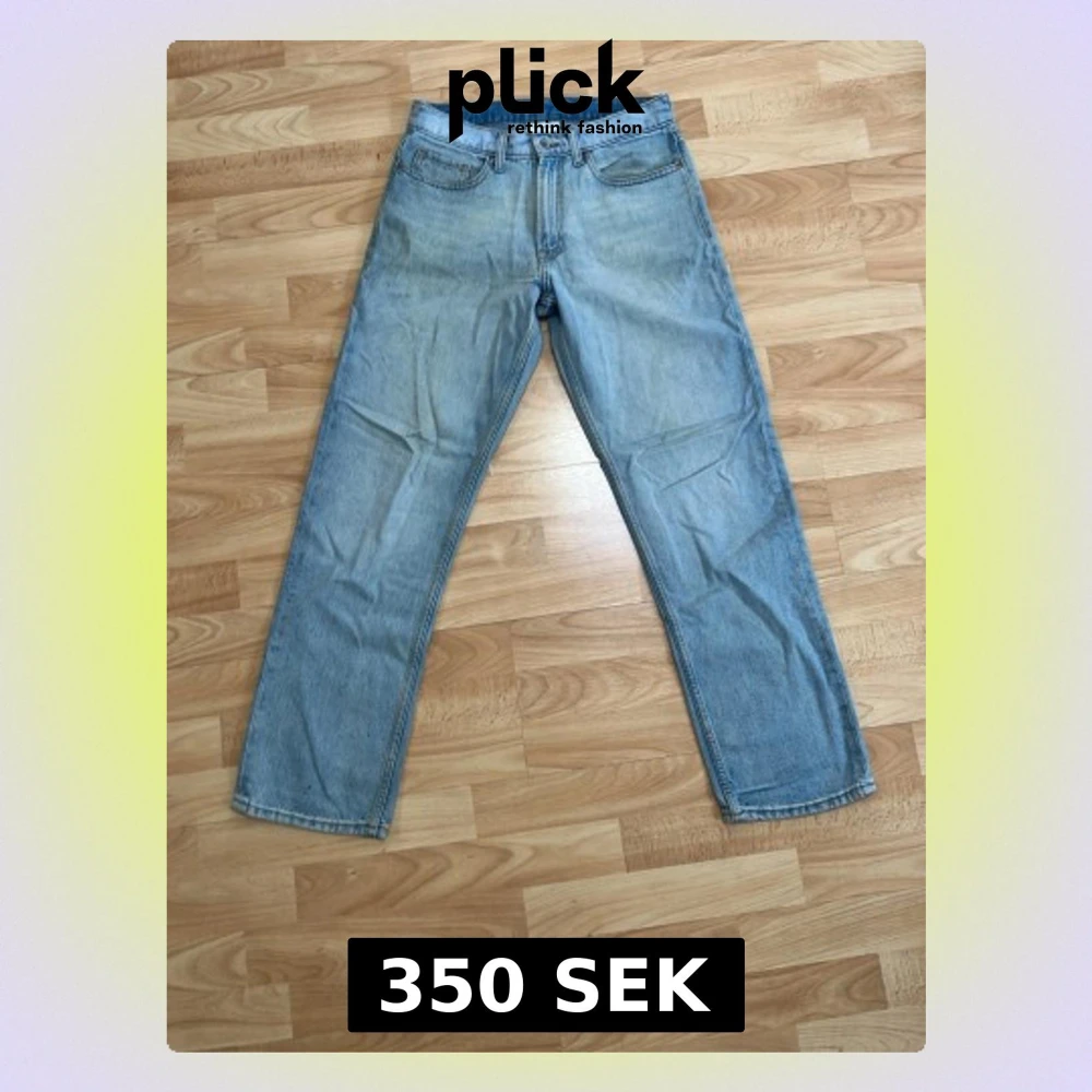 Säljer ett par ljusblå jeans från Weekday med rak passform och klassisk femficksdesign. Jeansen har normal midja och är tillverkade i denim av bomull. Perfekta för en avslappnad och trendig stil.