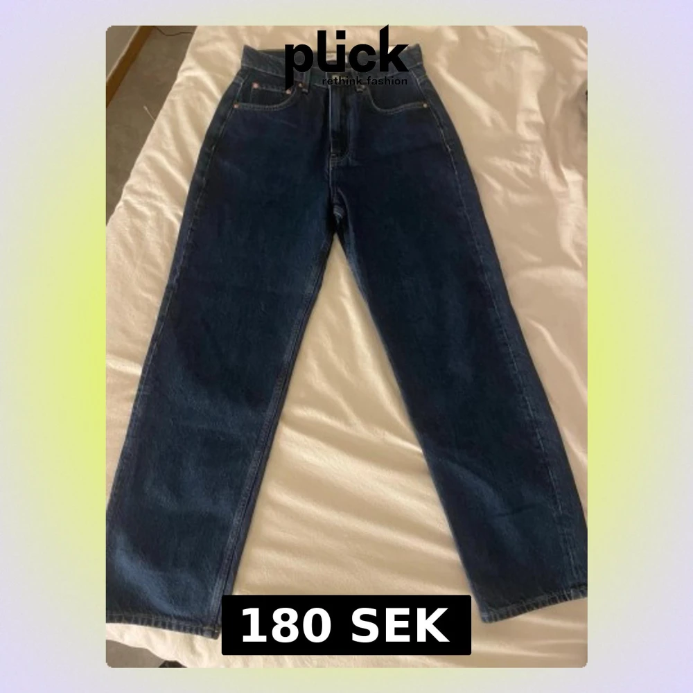 Säljer ett par mörkblå jeans från Weekday med rak passform och hög midja. Klassisk femficksmodell med knappgylf och tydliga sömmar. Jeansen är gjorda i kraftig denim och har en stilren look som passar till det mesta.