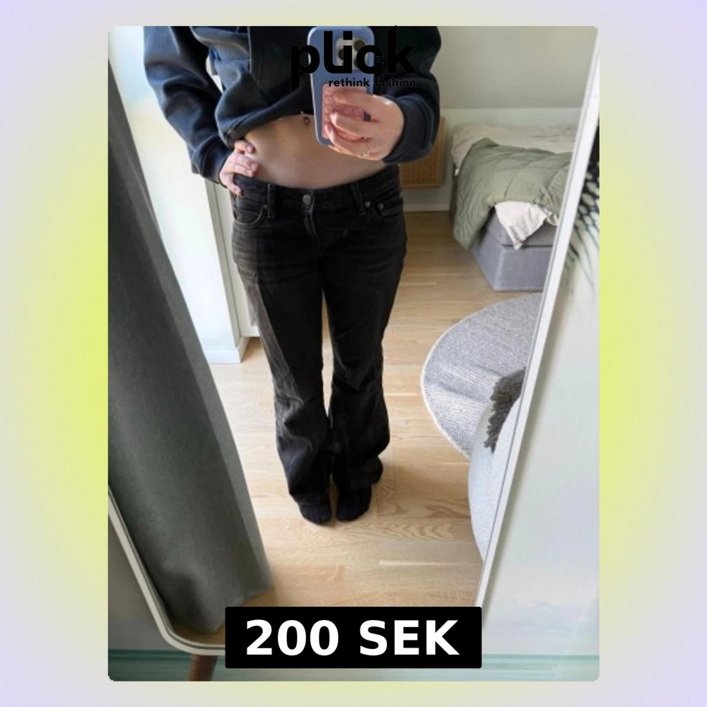 Säljer ett par svarta bootcut jeans med låg midja och klassisk femficksmodell. Jeansen har en snygg tvättad look och är tillverkade i ett mjukt denimtyg med lite stretch. Perfekta för dig som gillar en avslappnad men trendig stil.