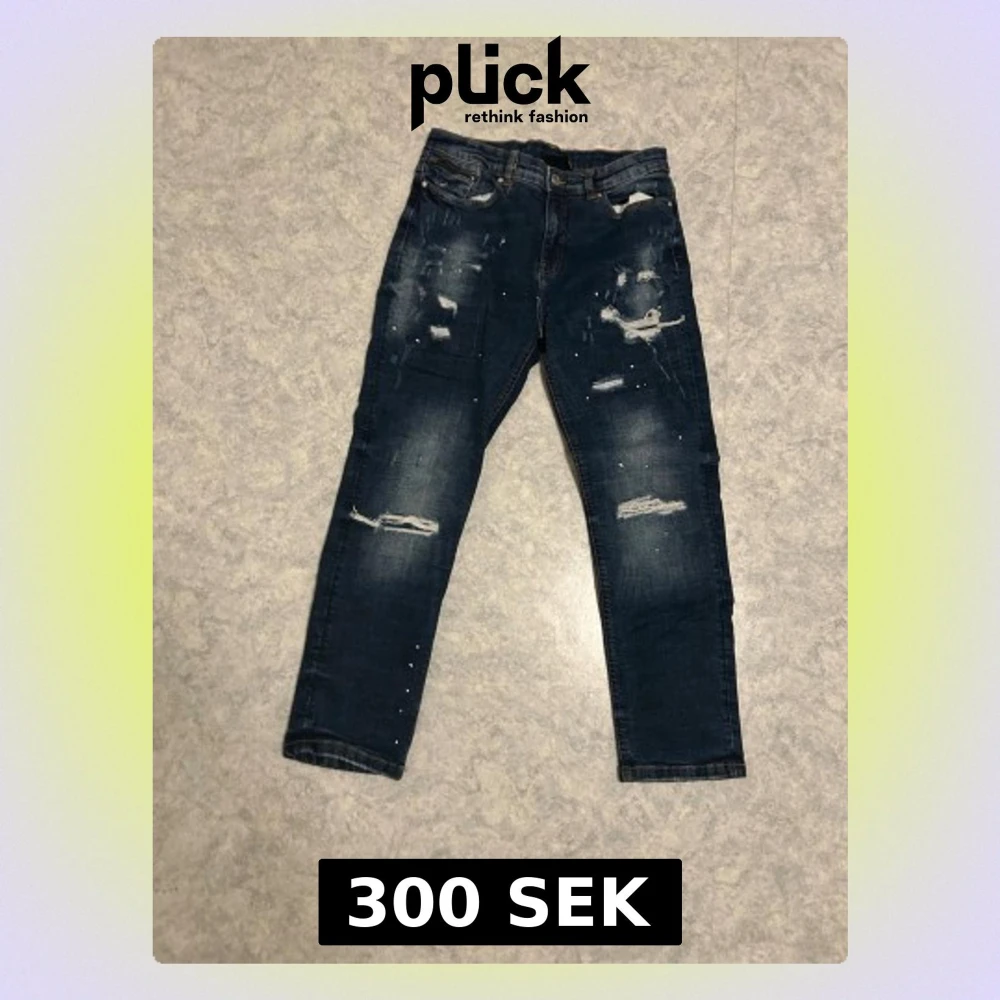 Snygga mörkblå jeans med slitningar och hål på framsidan. Jeansen har en klassisk femficksmodell och raka ben. Perfekta för en trendig och avslappnad look. Materialet är denim och färgen är tvättad mörkblå med ljusa detaljer.