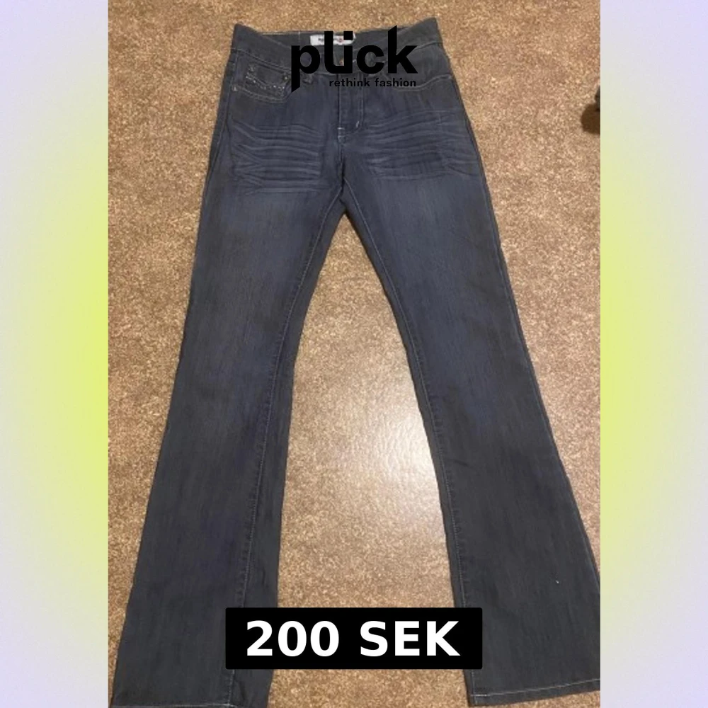 Snygga mörkblå jeans med bootcut passform och lowrise. Jag köpte de på vinted, men tyvärr passade de inte. Verkligen så snygga! Inga defekter. Innebenslängden är ca 78 cm. Står att det storlek 42, men de var lite för små för mig som brukar ha xs-s. Kom gärna med prisförslag💕