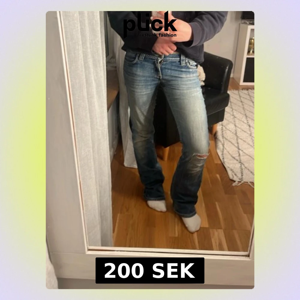 Säljer ett par blå bootcut jeans från Denim & Supply med slitningar och hål på ena knät. Jeansen har klassisk femficksdesign, ljus tvätt och detaljerade sömmar på bakfickan. Perfekta för en avslappnad och trendig look.