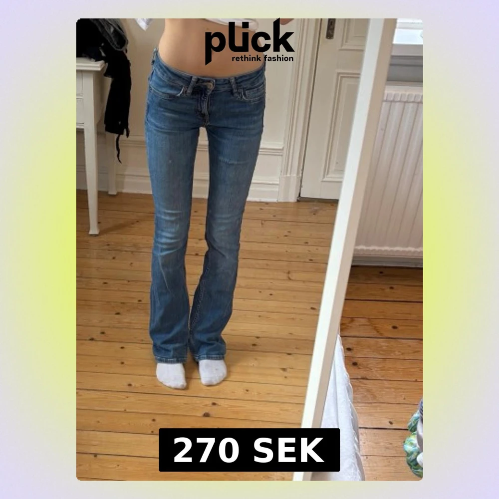 Lågmidjade bootcut jeans från Zara i storlek 32. Fint skick, liten slitning(se bild). Jag är 164cm och brukar ha xs💕