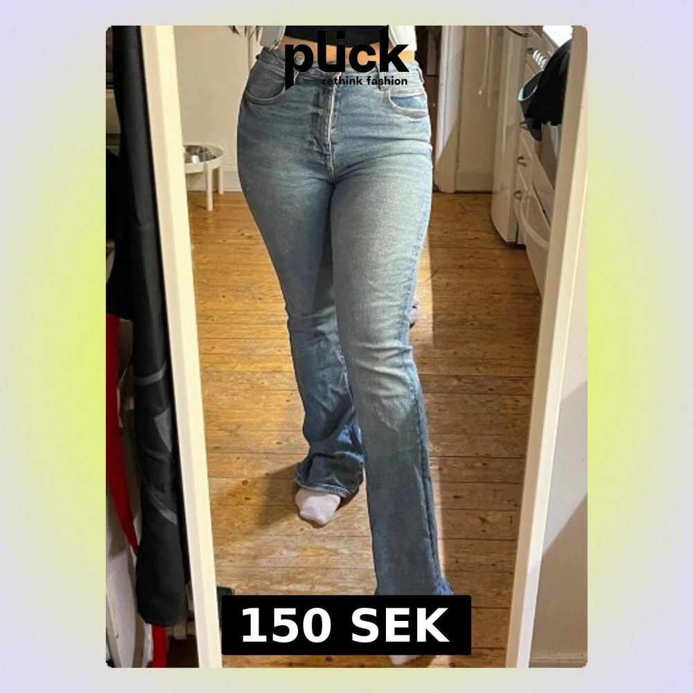 Det är två olika jeans exakt samma på allt bara olika färger, säljs separat. Säljer två par snygga blå bootcut jeans med hög midja och klassisk femficksdesign. Jeansen har en lätt tvättad look och är tillverkade i ett stretchigt denimtyg som sitter bekvämt. Perfekta för dig som gillar en retroinspirerad stil.