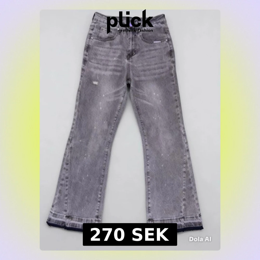 Snygga grå jeans med bootcut passform och slitna detaljer. Jeansen har en tvättad look med ljusa partier och råa kanter vid bensluten. Klassisk femficksmodell och knappgylf. Perfekta för en trendig och avslappnad stil.