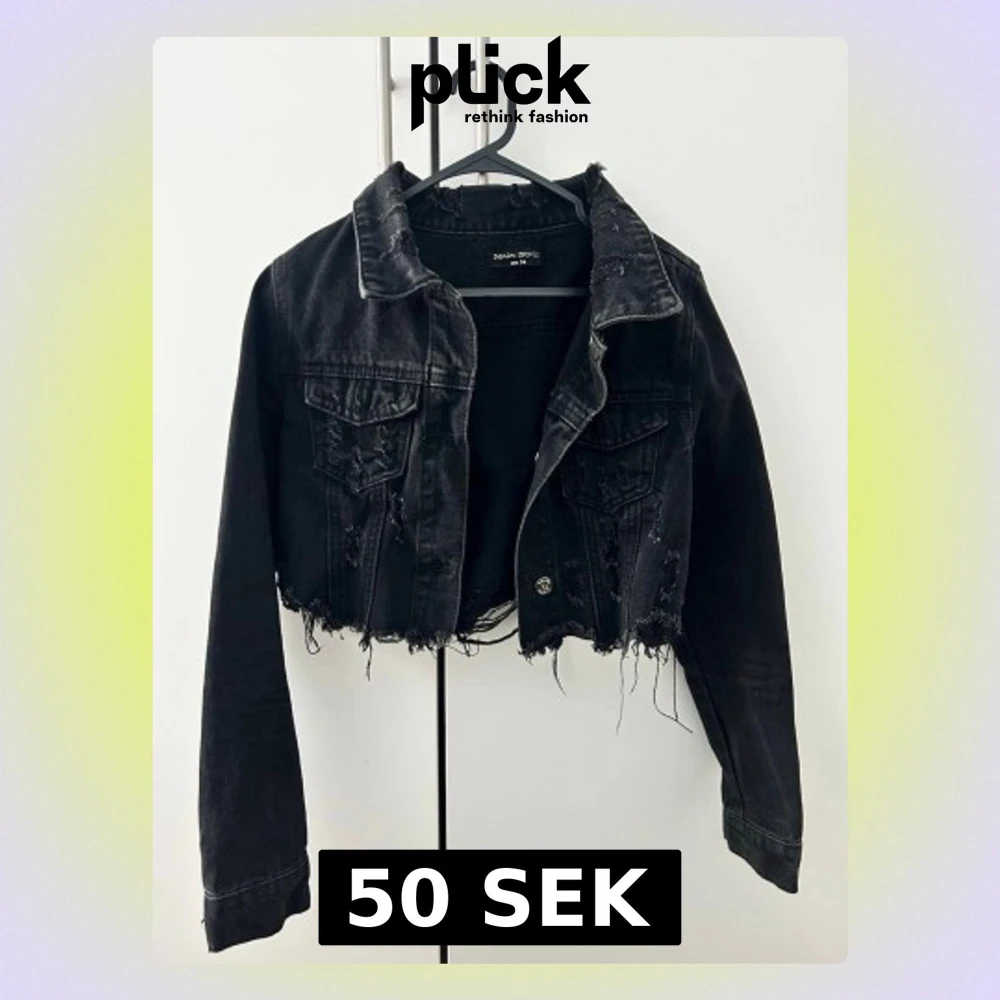 Svart croppad jeansjacka från Denim Studio med slitna detaljer och rå kant nertill. Köpte den i Göteborg men den passar inte längre
