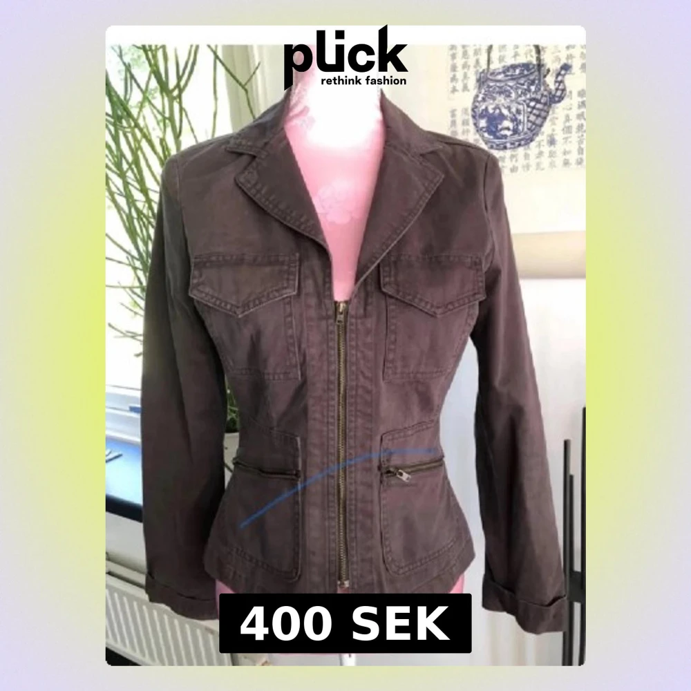 Snygg brun/grön jacka med figursydd passform och markerad midja. Jackan har två bröstfickor med lock, två snedställda fickor med dragkedja och klassisk krage. Stängs med dragkedja framtill och har långa ärmar. Perfekt för en trendig och avslappnad look.