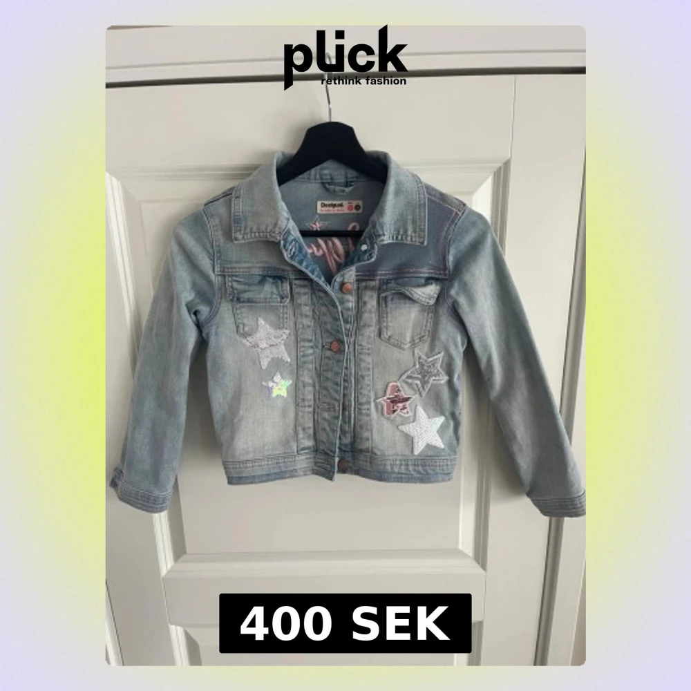 Snygg ljusblå jeansjacka från Desigual med coola stjärnpatches framtill och stort rosa Desigual-brodyr på ryggen. Klassisk krage, två bröstfickor och knappstängning. Perfekt för dig som vill sticka ut med en unik och trendig jacka. PRIS KAN DISKUTERAS VID SNABB AFFÄR!!