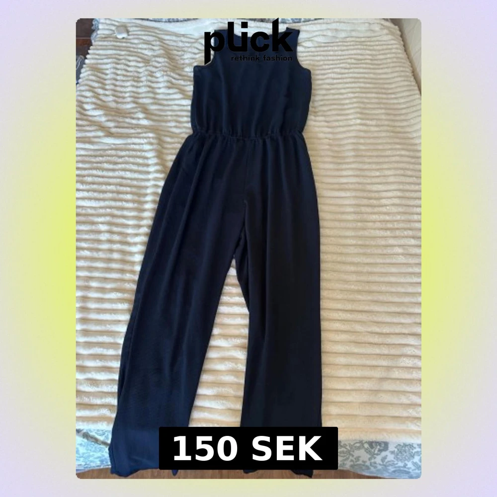 Stilren svart jumpsuit med rund halsringning och breda axelband. Modellen är ärmlös med resår i midjan för en snygg siluett och raka ben. Baksidan har dekorativa knappar upptill. Perfekt för dig som gillar enkel och clean stil.