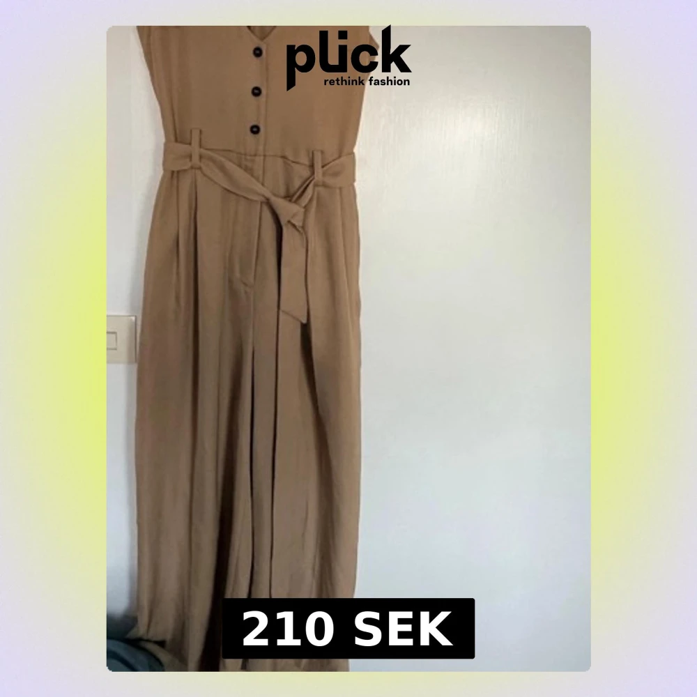 Stilren beige jumpsuit med vida ben, knappar framtill och tillhörande midjebälte. Ärmlös modell med v-ringning och fickdetaljer bak. Tillverkad i ett mjukt, lätt tyg som ger en avslappnad men snygg look.