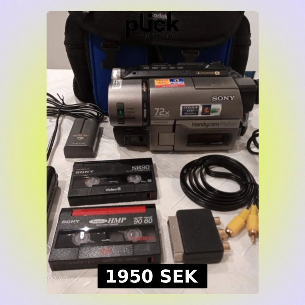 Sony Handycam CCD-TRV46E videokamera i silver och svart med 72x zoom, tillhörande laddare, batteri, för hi8 och Video8-band, AV-kablar och en väska från Kodak. Perfekt för dig som gillar retrofilmning och vill digitalisera gamla minnen. Digitalisera dina gamla video inspelningar till dator. Kamera kan skickas, ses i Trollhättan eller i Göteborg. Ring vid frågor på 0700441696