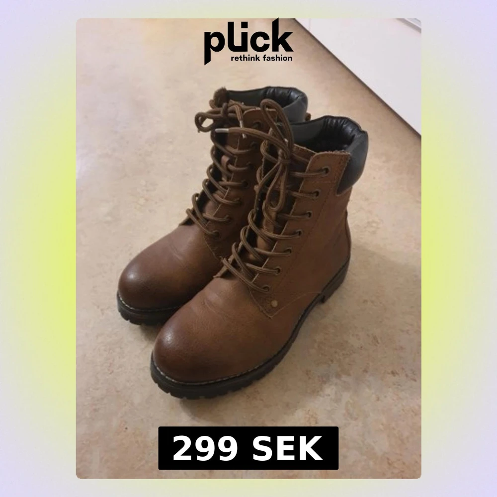 Säljer ett par bruna kängor med snörning och grov sula. Kängorna har en svart vadderad kant upptill och är tillverkade i ett läderliknande material. Perfekta för dig som gillar en klassisk och robust stil.