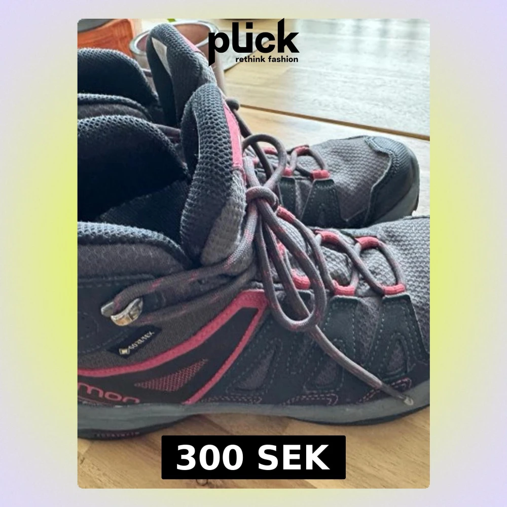 Säljer ett par Salomon kängor med Gore-Tex, perfekta för utomhusaktiviteter. De är grå med rosa detaljer, har snörning och är tillverkade i slitstarkt syntetmaterial och mesh. Skorna har hög komfort och bra grepp för vandring och äventyr.