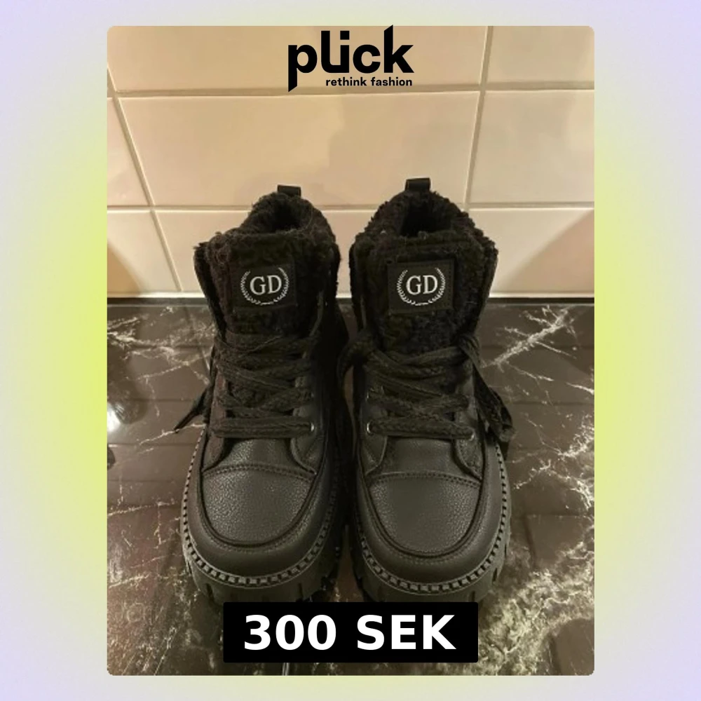 Säljer ett par svarta kängor från GD med chunky sula och teddyfoder. Kängorna har grova snören, högt skaft och detaljer i både läderimitation och textil. Perfekta för kalla dagar när du vill ha både stil och komfort.