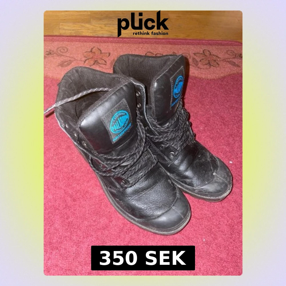 Säljer ett par svarta kängor från Palladium med grov sula och snörning. Kängorna har både läder- och textildetaljer samt tydlig logga på sidan och plösen. Perfekta för dig som vill ha en cool och tålig look.