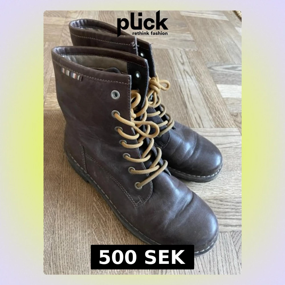 Säljer ett par bruna kängor från Ecco i äkta läder. Normalhög känga med snyggt matchad snörning. Sulan är robust och kängorna har en klassisk stil och passar till de flesta tillfällena från höst till vår. Använda en vinter. Mycket sköna! Kommer hålla länge!