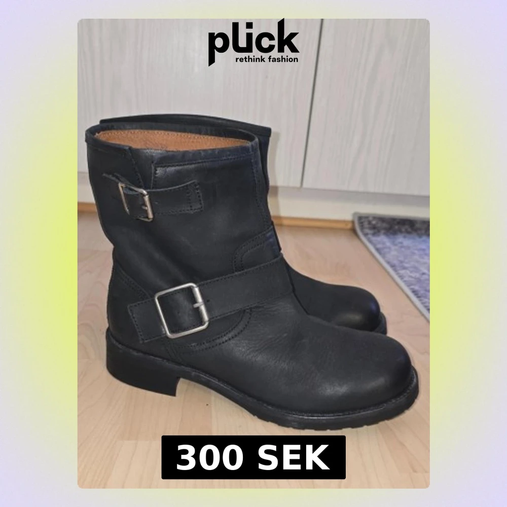 Säljer ett par svarta bikerinspirerade kängor i skinn med två silvriga spännen på sidan. Kängorna har rund tå, grov sula och ett klassiskt, stilrent utseende. Perfekta för dig som vill ha en tidlös look.