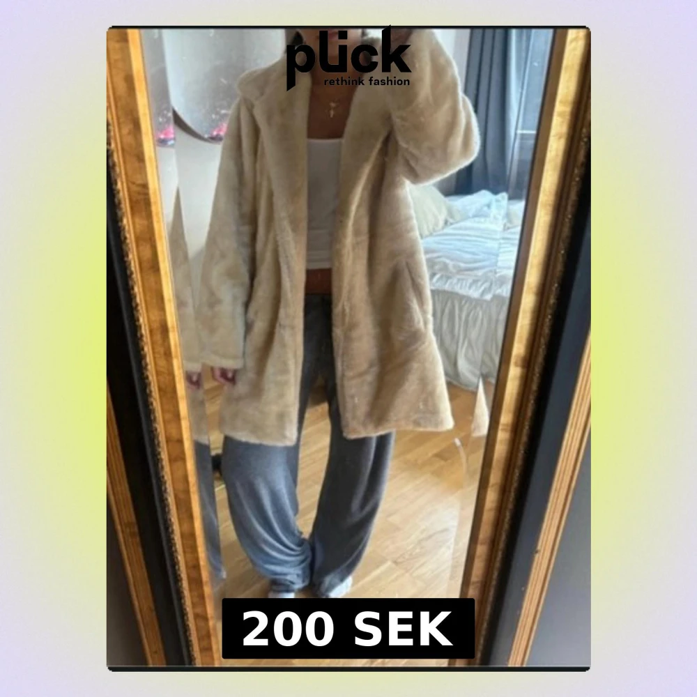Säljer en beige kappa i mjuk fuskpäls med avslappnad passform och stora fickor. Kappan har en bred krage och går ner till låret, perfekt för att hålla sig varm och snygg under kyliga dagar. Enkel att matcha med olika outfits.