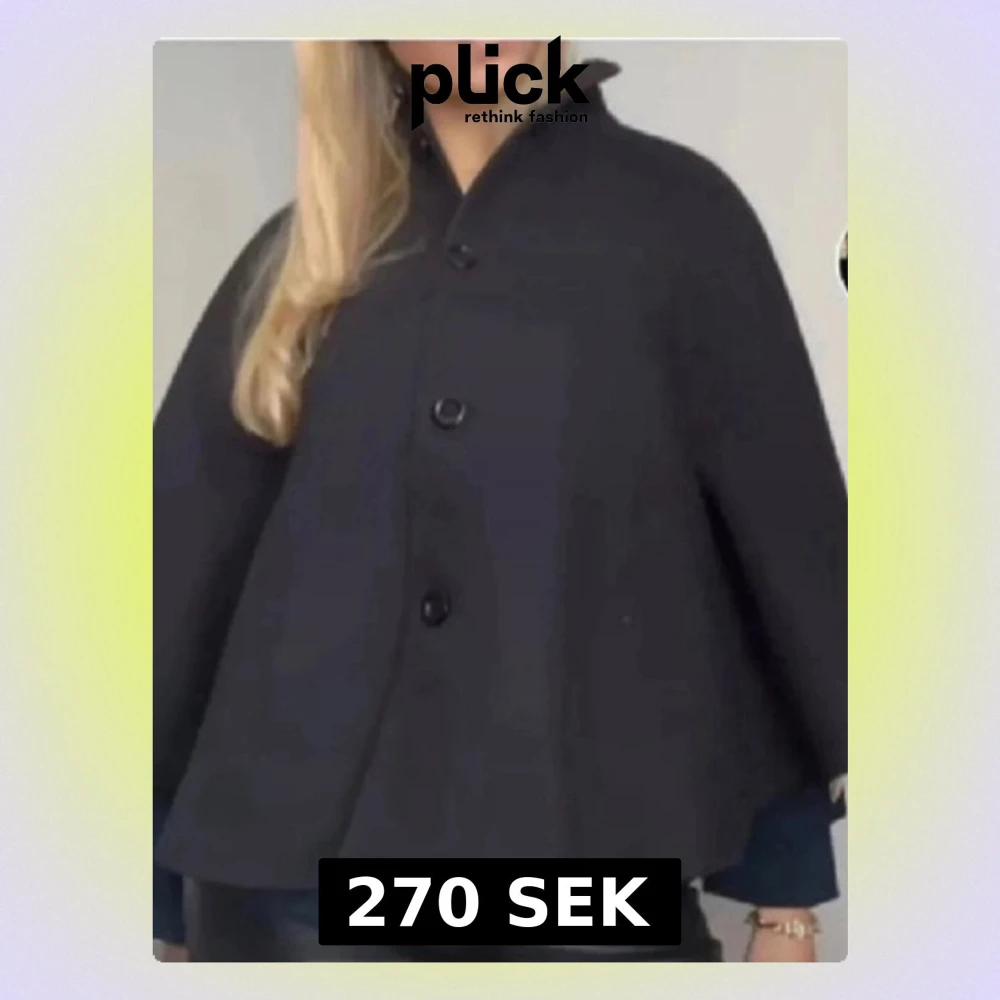 Stilren svart cape från H&M med knappar framtill och hög krage. Modellen är vid och har fickor på sidorna samt slät insida. Perfekt för lager-på-lager och ger en cool siluett till din outfit.