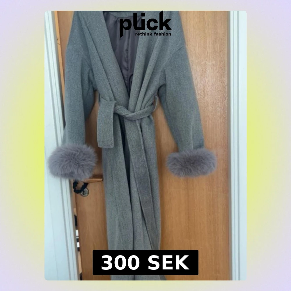 Lång grå kappa med stora slag, knytskärp i midjan och fluffiga pälsdetaljer vid ärmsluten. Kappan har en mjuk och elegant look, perfekt för att höja din outfit under kyliga dagar.