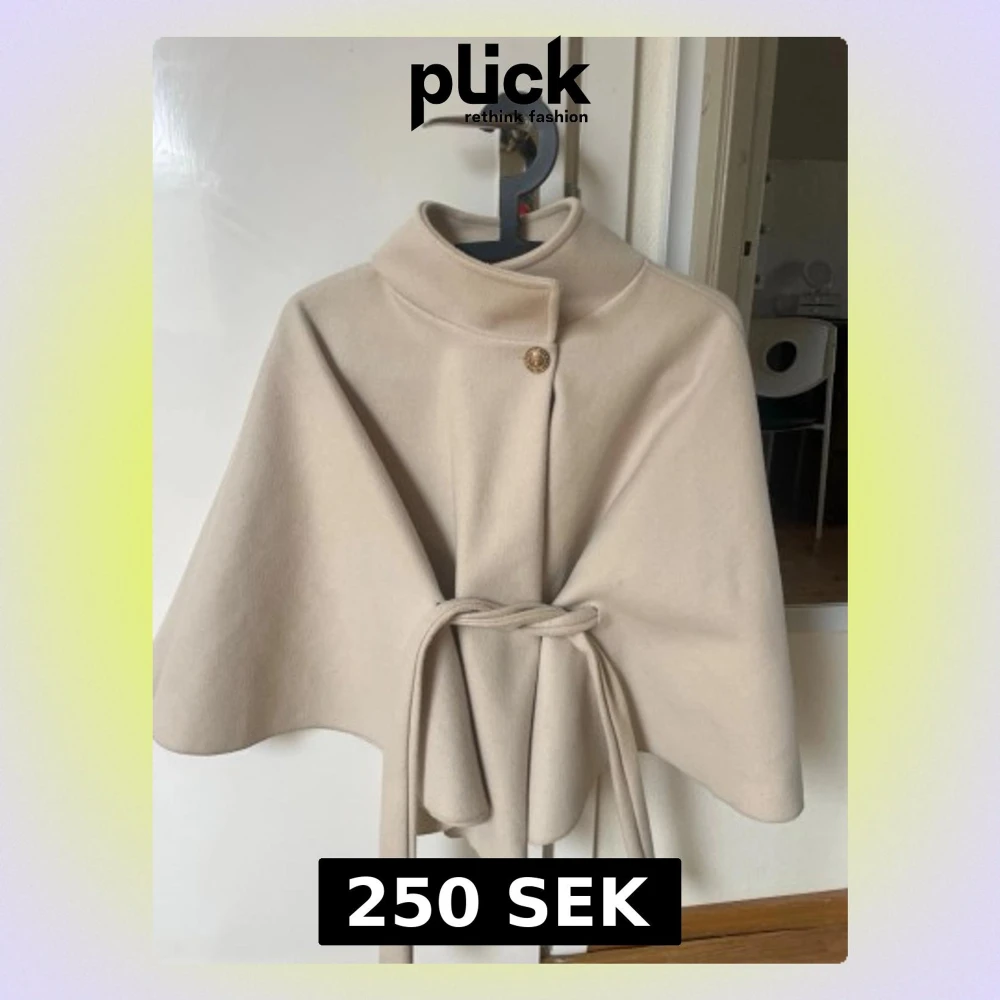 Stilren beige cape-kappa med hög krage och ett dekorativt guldknappsfäste vid halsen. Kappan har ett matchande knytband i midjan och vida ärmar för en avslappnad men chic look. Perfekt för lager-på-lager och höstiga outfits.