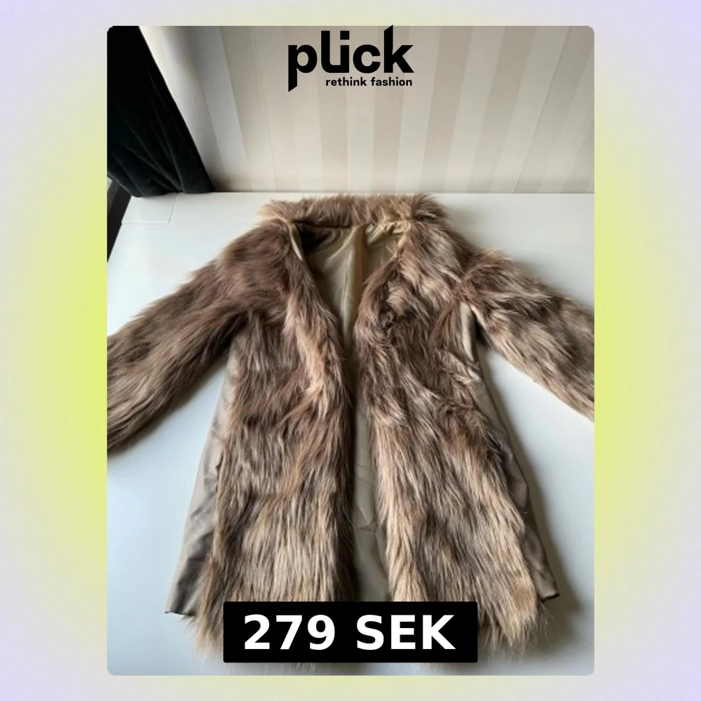 Snygg brun fuskpäls kappa med mjukt beige foder. Kappan har lång ärm och en rak, något oversized passform. Pälsen är fluffig och ger en lyxig känsla, perfekt för att höja din outfit. Inga synliga knappar eller dragkedja framtill.