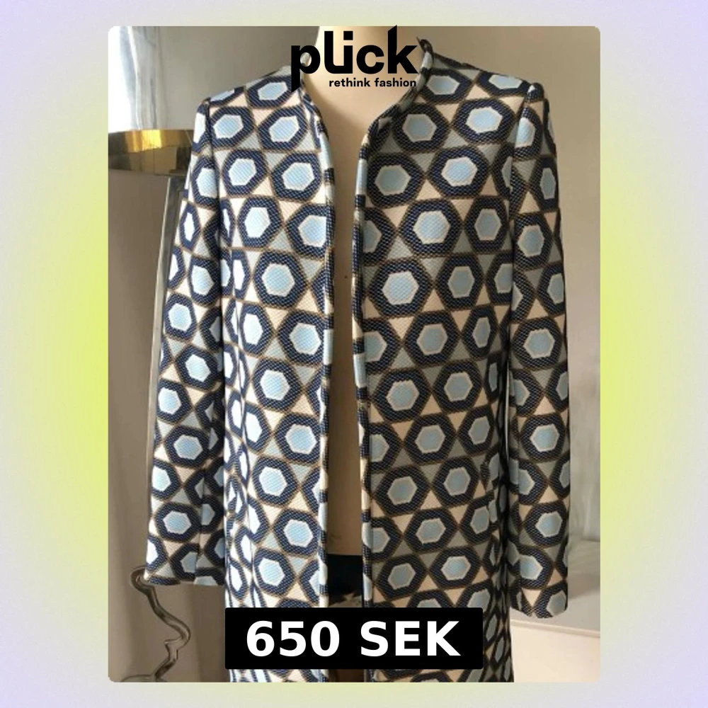 Unik kappa med grafiskt hexagonmönster i blått, beige och vitt. Rak modell med rundad halsringning och dolda fickor i sidorna. Tjockare tyg med struktur som ger en cool retrovibe. Perfekt för dig som vill sticka ut med din stil.