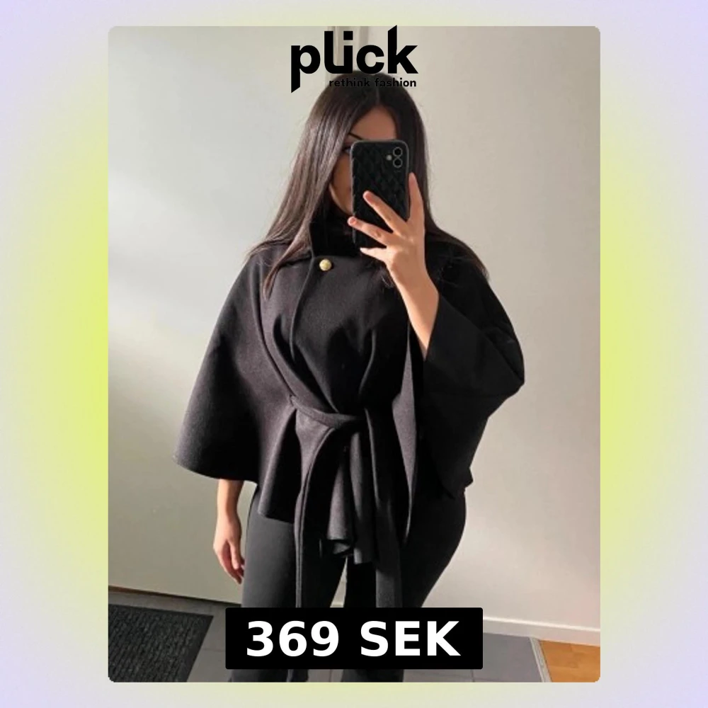 Stilren svart cape-kappa med vida ärmar och knytband i midjan. Kappan har en hög krage och en dekorativ guldig knapp framtill. Perfekt för dig som gillar en trendig och elegant look.
