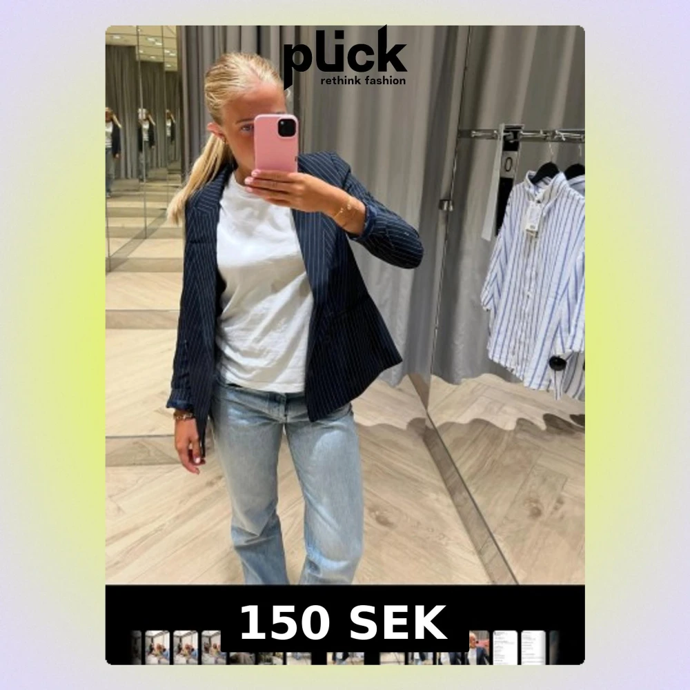Snygg mörkblå kavaj med vita tunna ränder. Passar någon som har upp till storlek M oxå. Perfekt för att ge en stilren och trendig look. Materialet är slätt och kavajen har en figurnära passform.