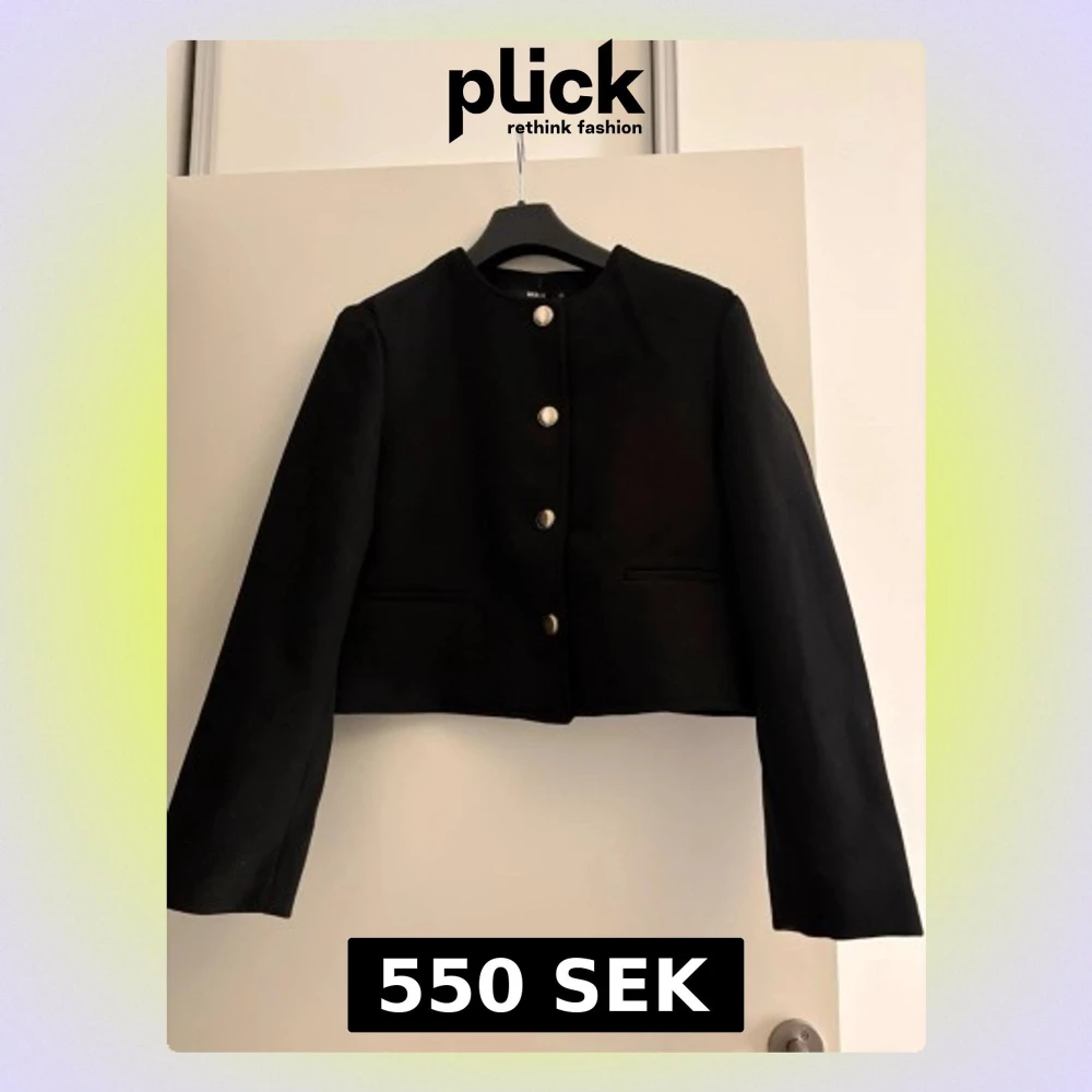 Stilren svart kavaj i kort modell med raka axlar och långa ärmar. Kavajen har fyra dekorativa silverknappar framtill och två diskreta fickor. Materialet är tjockare tyg, perfekt för en trendig look. Oanvänd strl M