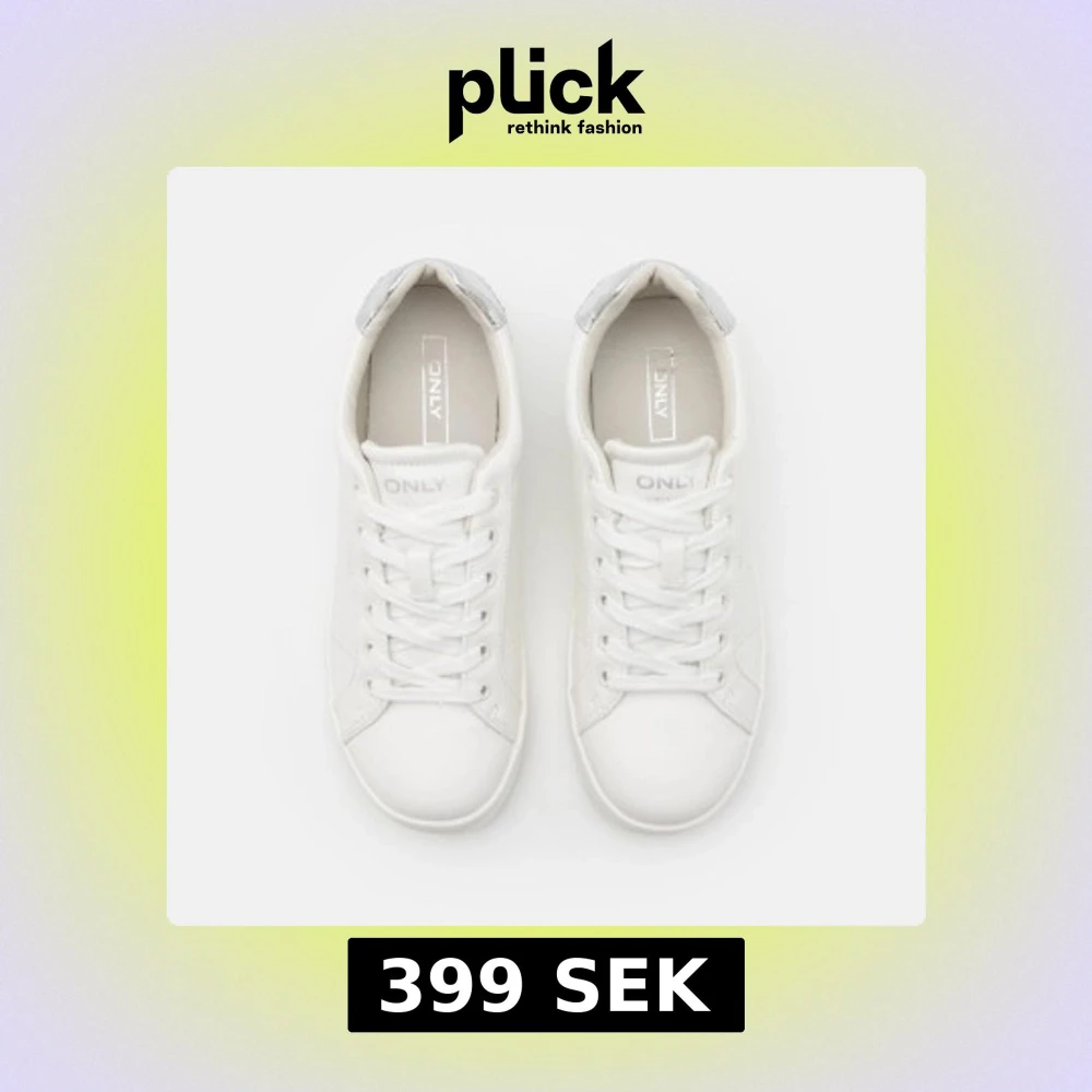 Stilrena vita sneakers från Only med snörning och en glittrig silverdetalj på hälen. Perfekta för en trendig och avslappnad look.