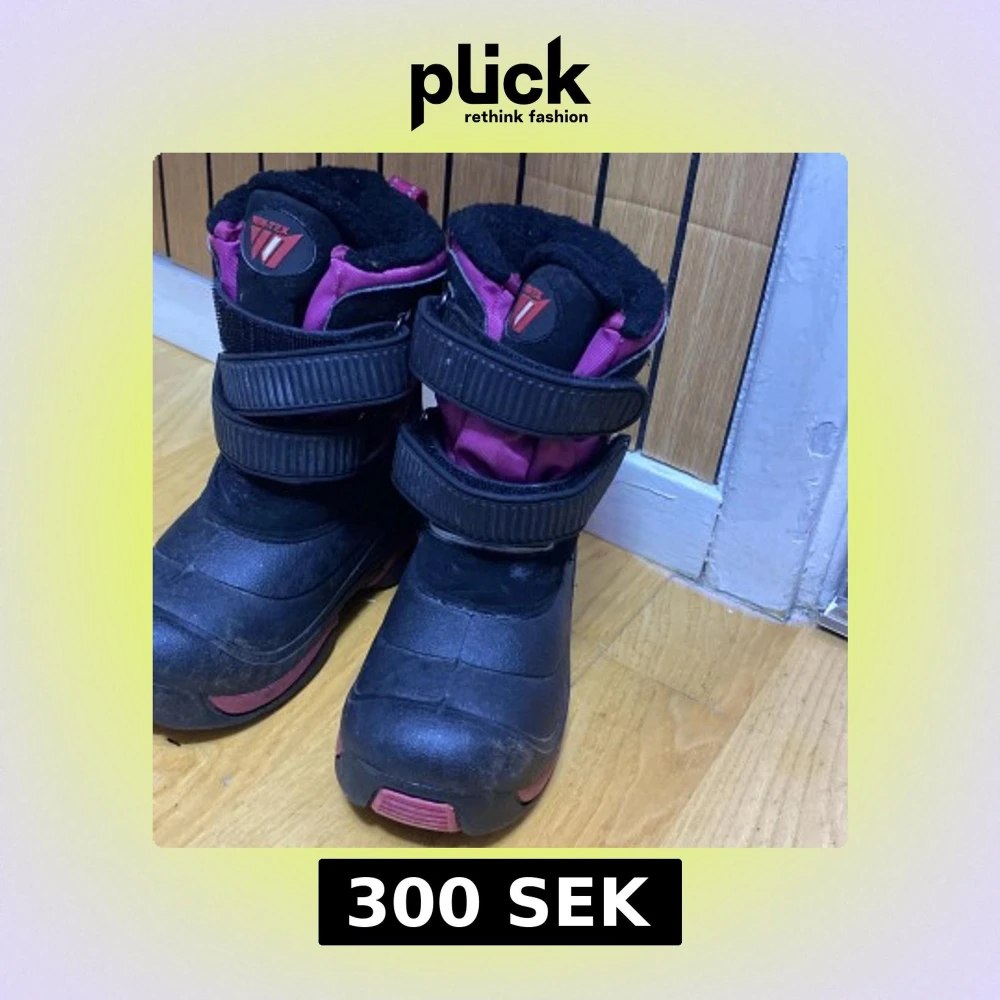 Säljer ett par svarta och rosa vinterstövlar från Vintex med breda kardborreband och mjukt foder. Skorna har en robust platt sula och är tillverkade i syntetmaterial med detaljer i textil. Perfekta för kalla dagar och snö.