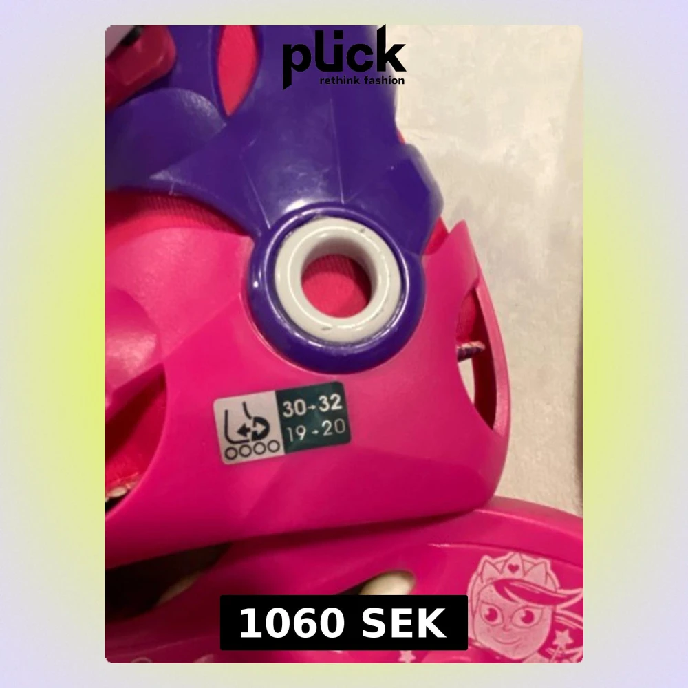 Säljer ett par färgglada rullskridskor från Oxelo Play3 i rosa och lila med vita hjul och coola spännen. Skorna har justerbar storlek och är dekorerade med stjärnor och en tecknad figur på sidan. Perfekt för dig som vill rulla fram med stil!