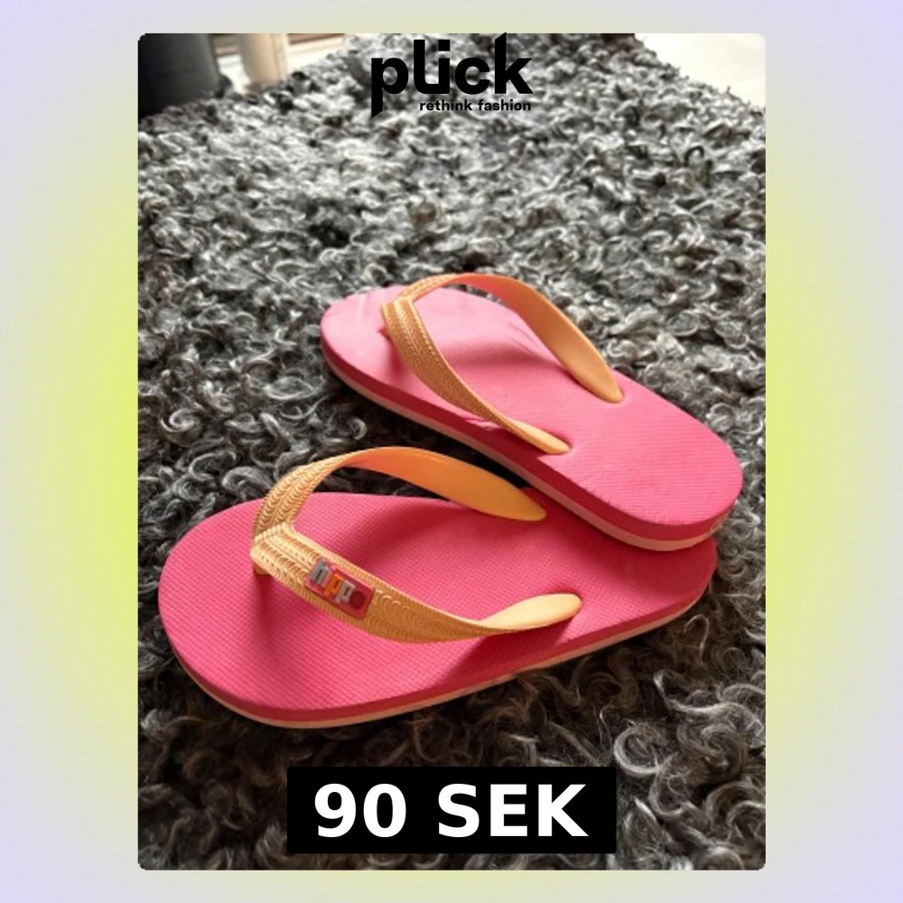 Snygga och sköna, oanvända flipflops i 2 olika rosa nyanser med ljusorangea remmar och Hippo-logga på sidan. Sulan är platt och har räfflad undersida för extra grepp. Perfekta för sommardagar och strandhäng, tillverkade i syntetmaterial som torkar snabbt.