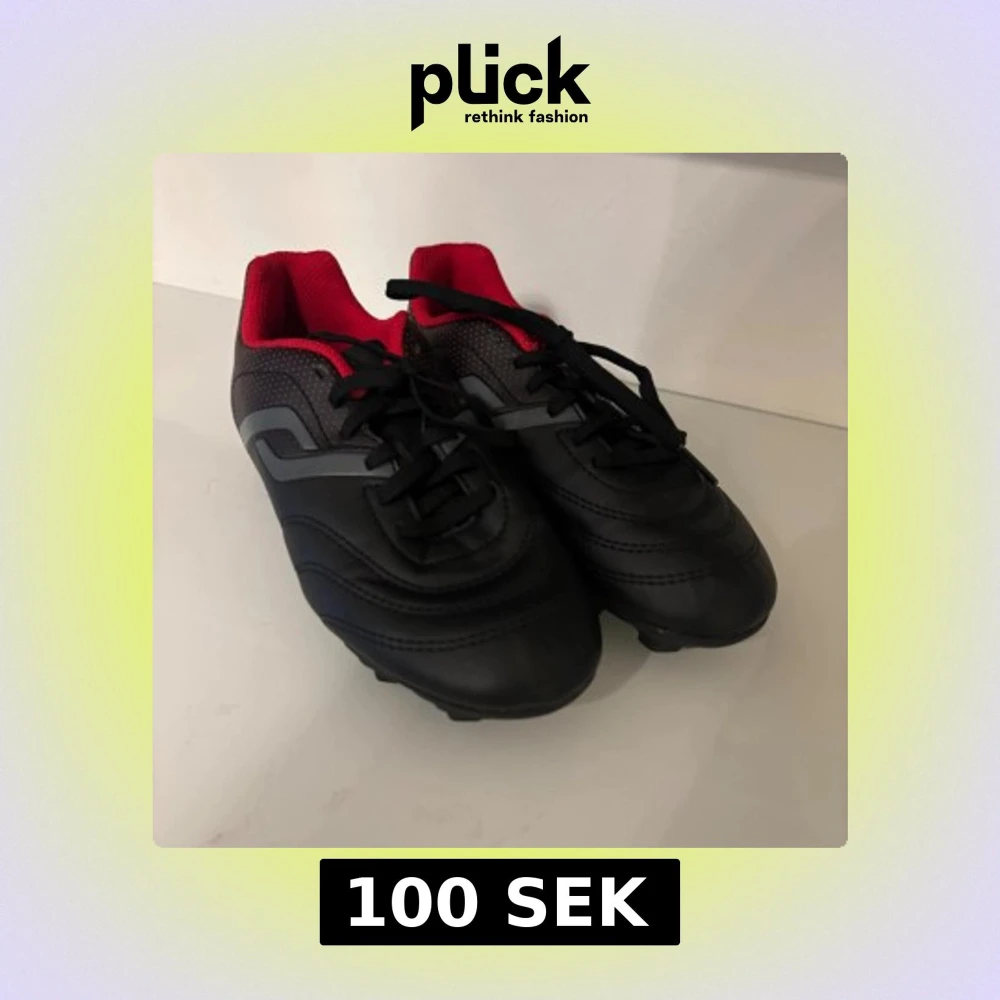 Snygga svarta fotbollsskor med röd insida och svarta snören. Skorna har en rund tå och platt sula med dobbar för bra grepp på planen. Sidan har diskreta grå detaljer och små röda prickar. Tillverkade i syntetmaterial som tål tuffa matcher.