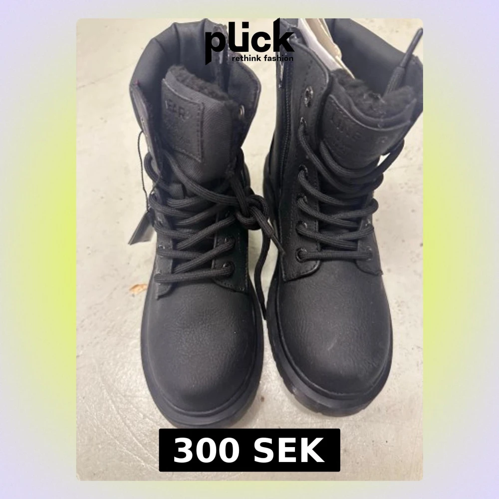 Tuffa svarta boots från Linear of Sweden med grov sula och snörning. Skorna har dragkedja på sidan för enkel påtagning och är fodrade med mjukt, varmt foder. Tillverkade i syntetmaterial med rund tå och robust design, perfekta för kalla dagar.