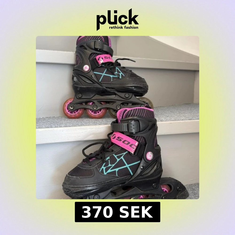 Säljer ett par svarta inlines med coola turkosa mönster och detaljer i rosa. Skorna har snörning, kardborreband och spänne för extra bra passform. Hjul i rosa och svart, robust konstruktion i syntetmaterial. Perfekta för dig som vill cruisa runt med stil! Storleken funkar från 31-34