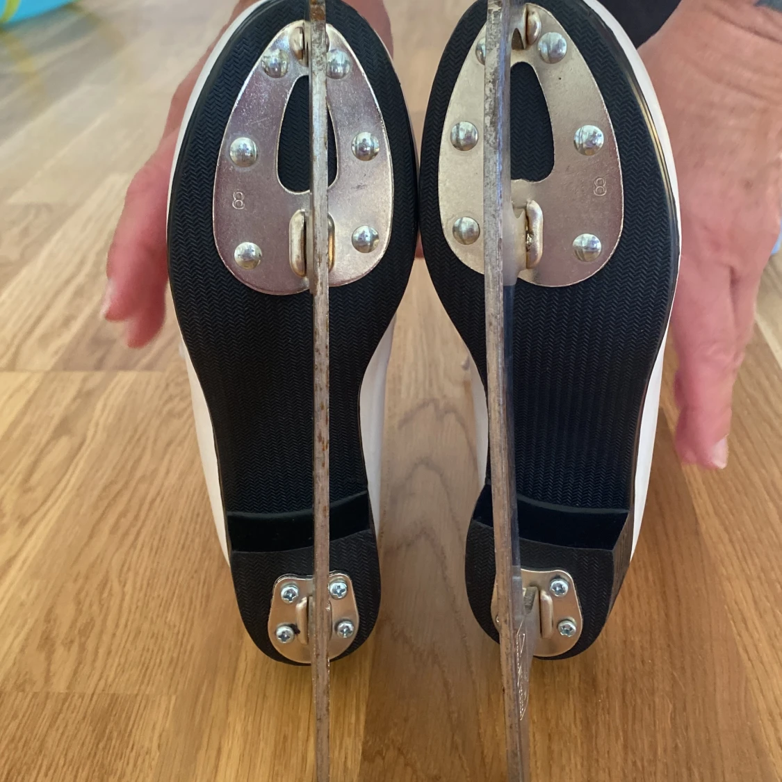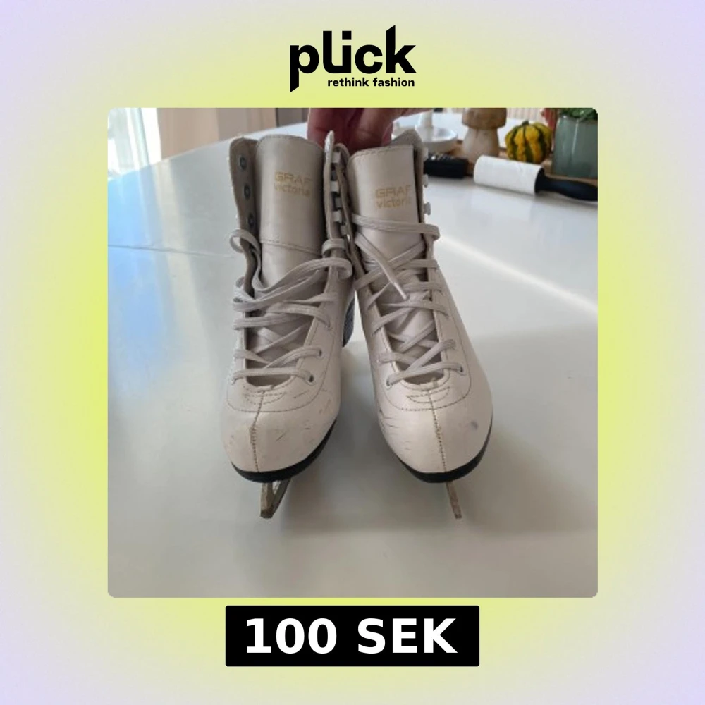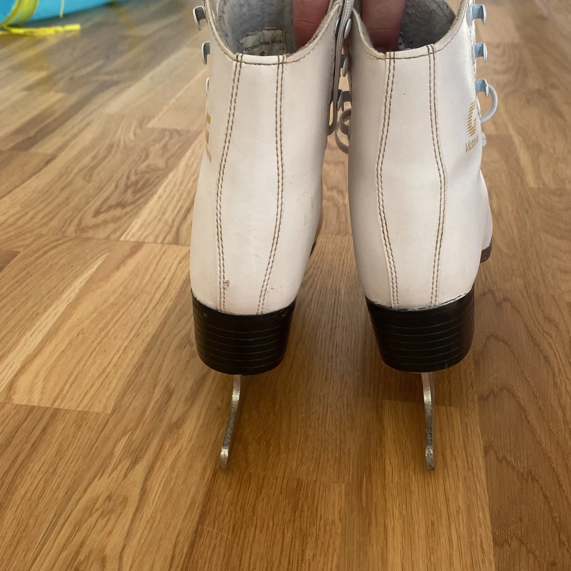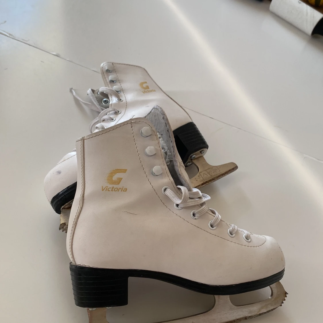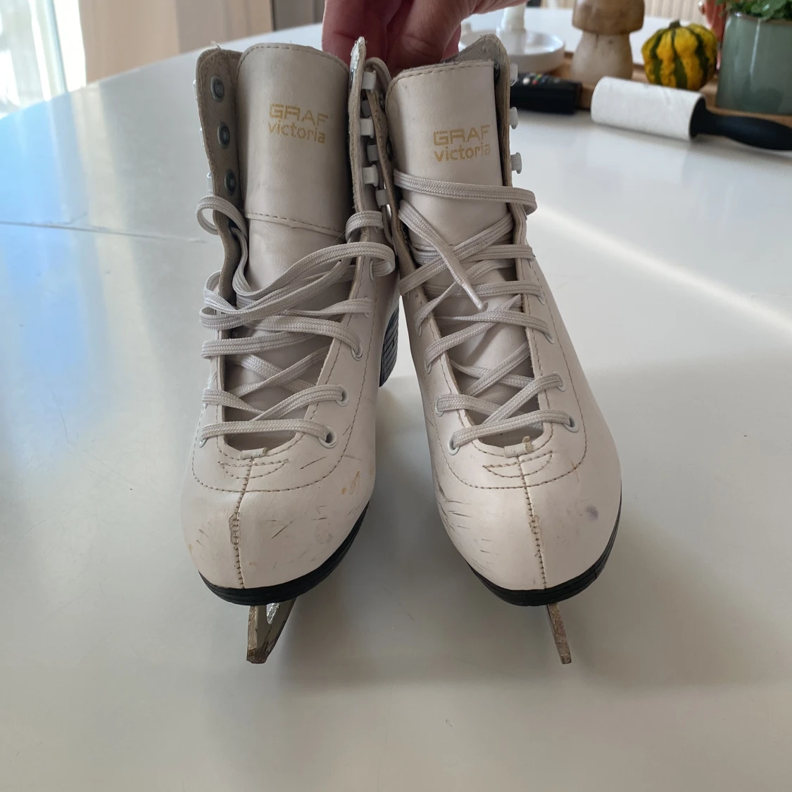 Säljer ett par klassiska vita konståkningsskridskor från Graf, modell Victoria. Skorna har snörning, gulddetaljer och svart klack. Tillverkade i skinn med robust sula och fodrad insida för extra komfort. Perfekta för dig som vill glida fram på isen med stil. De behöver slipas. Kan sänka pris till 85 om det är för dyrt.