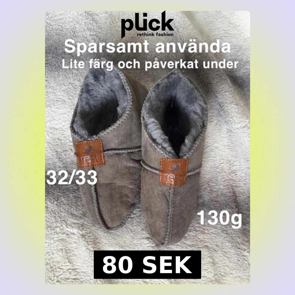 Mysiga grå tofflor från Rest i storlek 32/33. Tofflorna har en rund tå och dekorativt brunt lädermärke framtill. Perfekta för kalla dagar hemma.🌸 Sparsamt använd men lite påverkad under och någon fläck. Otvättade. Storlek 32/33