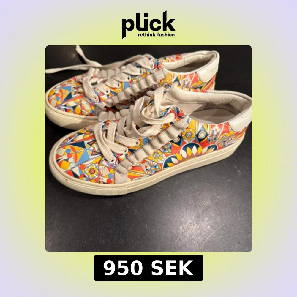 Säljer ett par unika Tory Burch sneakers med ett färgglatt geometriskt mönster i rött, blått, gult och orange. Skorna har snörning och en bekväm sula, perfekta för att liva upp vilken outfit som helst.