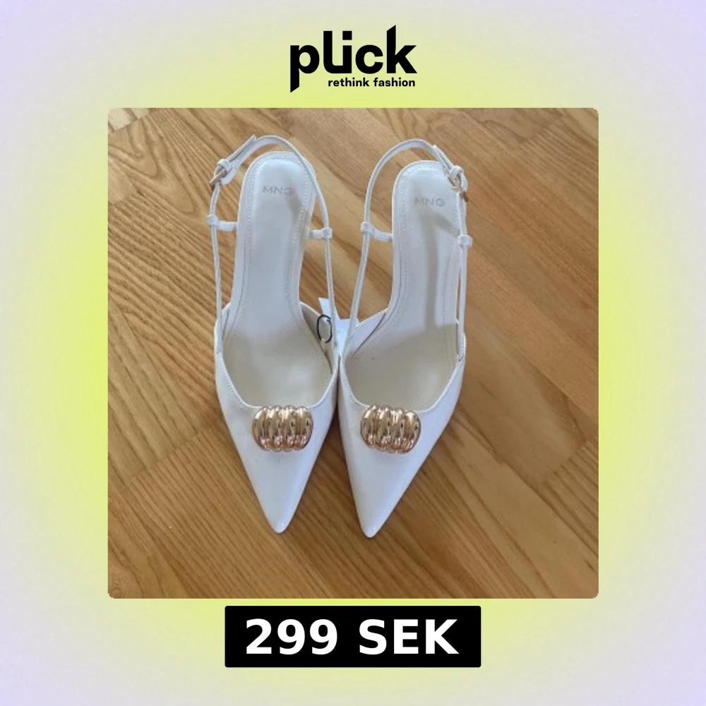 Snygga vita pumps från MNG med spetsig tå och smal klack. Skorna har en elegant guldfärgad detalj framtill och tunna remmar runt hälen. Perfekta för dig som vill sticka ut med en stilren och trendig look. Helt nya (nypris 299kr)