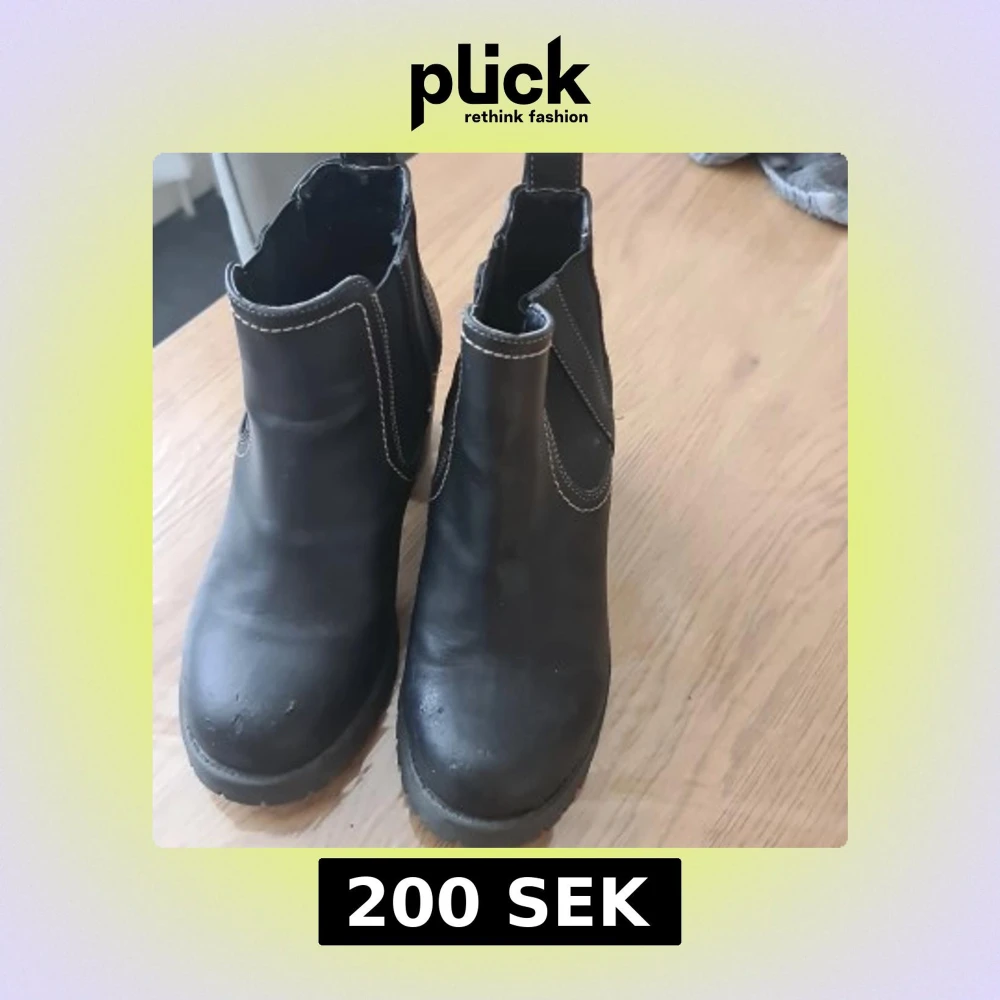 Snygga svarta chelsea boots i skinnimitation med markerade vita sömmar och elastiska partier på sidorna. Grov sula och stabil klack ger en cool look och extra höjd. Perfekta till jeans eller kjol för en trendig stil.