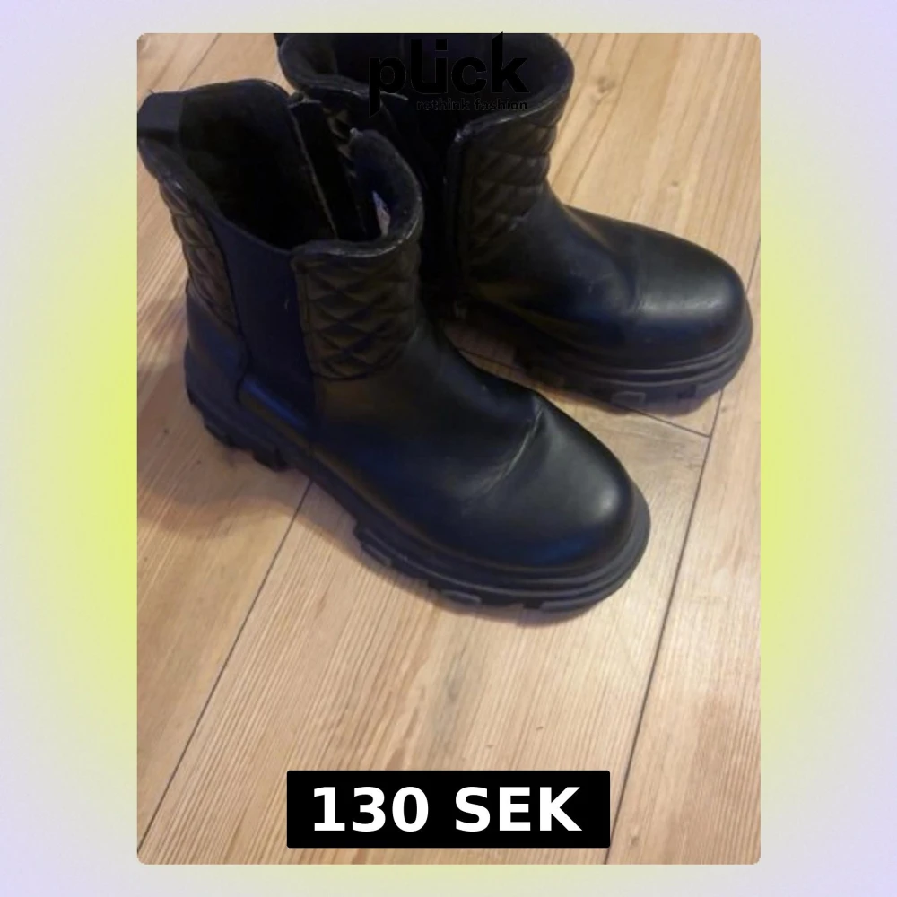 Säljer ett par chunky svarta boots i storlek 36 med quiltad detalj upptill och grov sula. Skorna har dragkedja på sidan för enkel påtagning och är tillverkade i ett skinnliknande material. Perfekta för dig som vill ha en edgy look till hösten eller vintern.