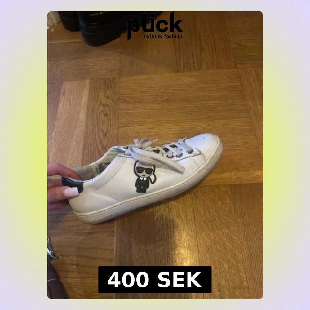Säljer ett par vita sneakers från Karl Lagerfeld med coolt tryck av Karl på sidan och svart detalj på hälen. Skorna har snörning, rund tå och är gjorda i skinn. Snygga och stilrena med logga på både sula och bakkappa.