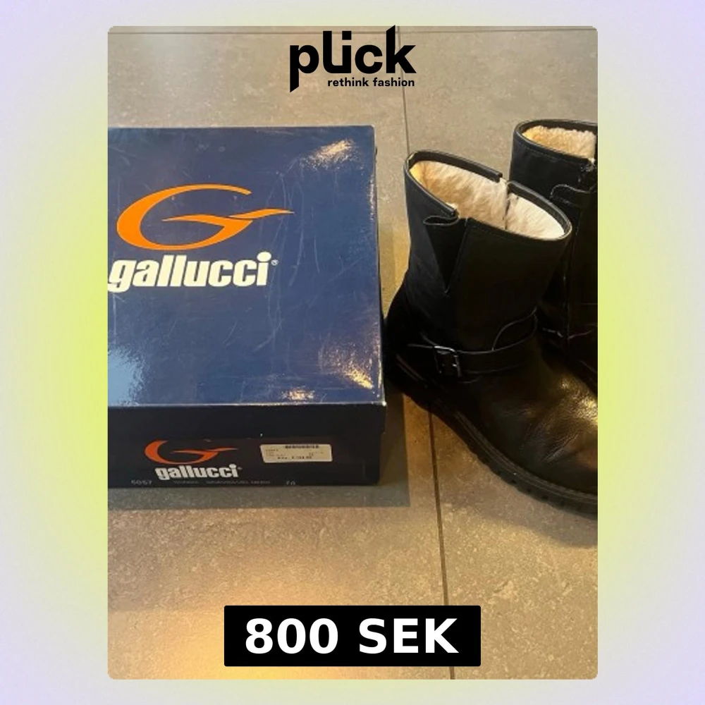 Säljer ett par svarta skinn boots från Italienska Gallucci i storlek 36. Skorna är i skinn med grov sula, dragkedja på sidan och spänndetalj vid ankeln. Insidan är fodrad med mjukt ljust material för extra komfort. Perfekta för dig som gillar en stilren och robust look.