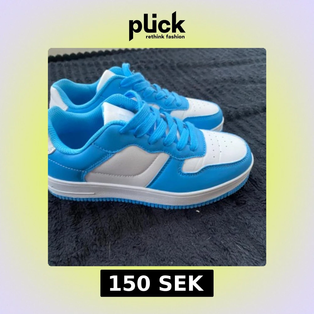 Säljer ett par fräscha sneakers i blått och vitt med klassisk design. Skorna har rund tå, platt sula och är tillverkade i syntetmaterial. Perfekta för dig som gillar sportig stil och vill ha bekväma skor till vardagen.