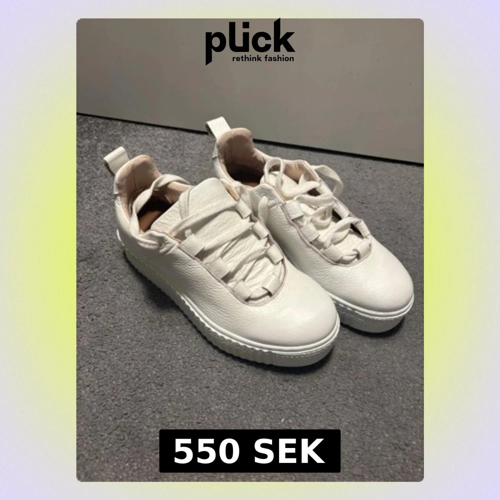 Säljer ett par vita sneakers i skinn med grov, räfflad sula och breda snören. Skorna har en clean look med rund tå och detaljer i samma färg. Insidan är ljusbeige och de har en modern, chunky vibe som passar till det mesta. Stort sett oanvända. Storlek 36