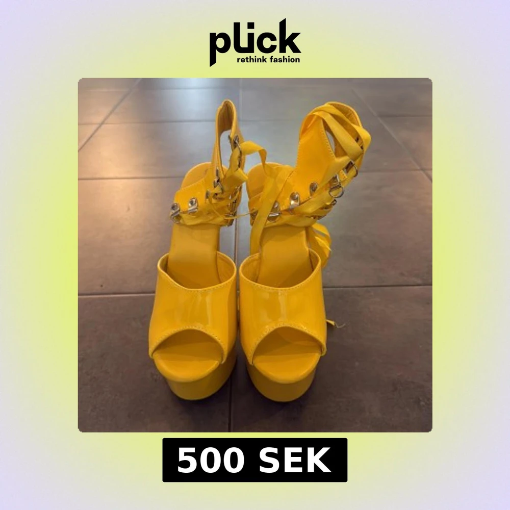 Supercoola gula platåsandaler med 15cm hög klack och öppen tå. Skorna har glansig finish, snörning runt ankeln med metallöglor och bred rem över foten. Perfekta för dig som vill sticka ut med färg och höjd. Säljs i storlek 36.