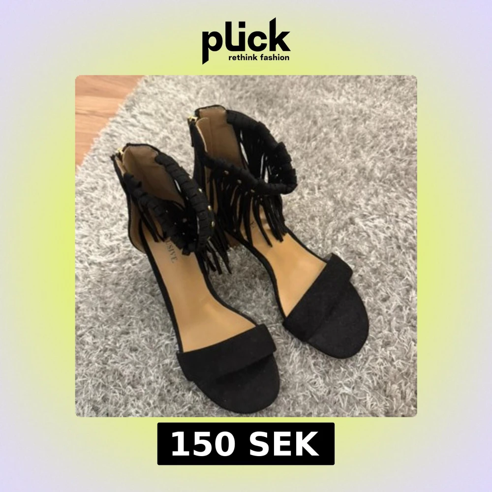 Snygga svarta klackar från The Exclusive med bred klack i trälook och öppen tå. Runt ankeln sitter en bred rem med fransar och små guldfärgade nitar som ger en cool boho-vibe. Skorna är gjorda i mocka och har en platt sula framtill.