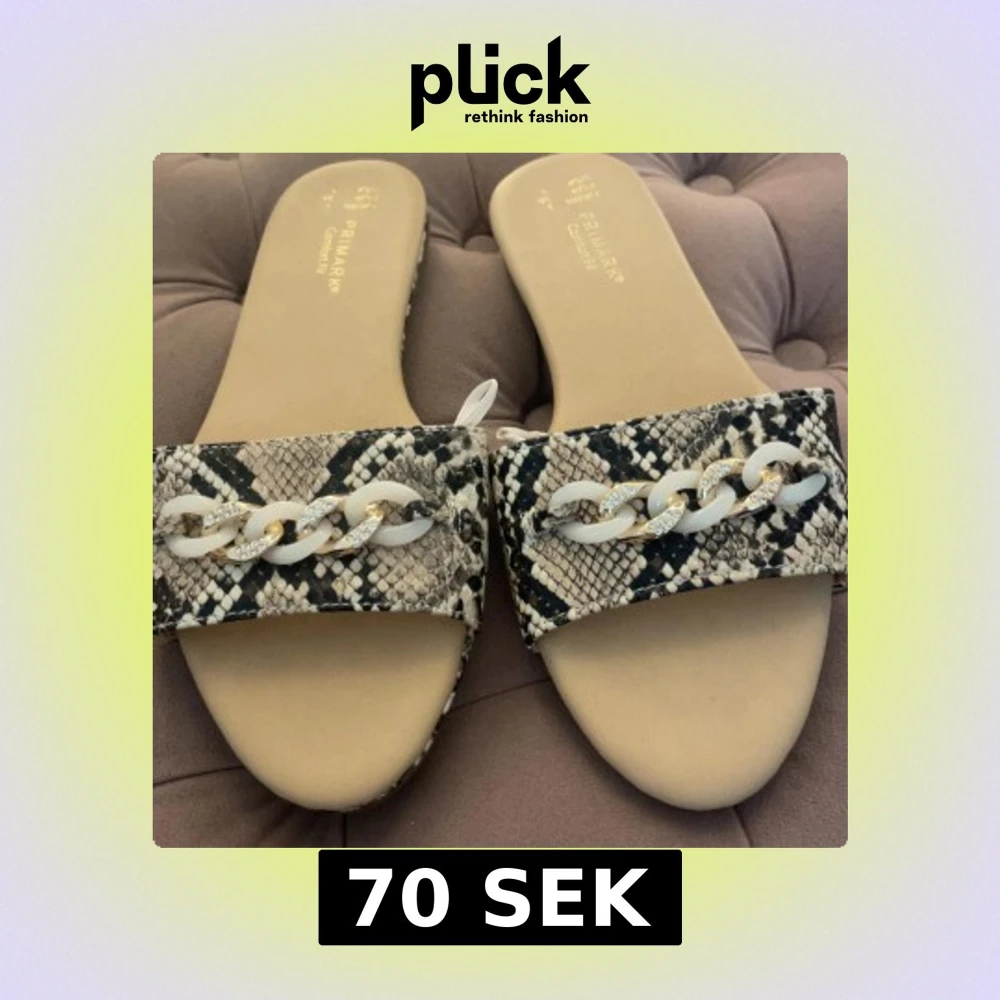 Snygga sandaler från Primark med ormskinnsmönster i beige och svart. Dekorerade med en chunky kedja i vitt och guld med glittriga detaljer. Platt sula och öppen tå.